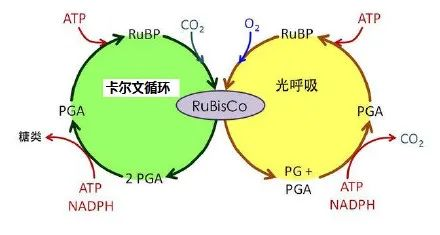 另外,核酮糖-1,5-二磷酸羧化酶可以催化核酮糖-1,5-二磷酸与二氧化碳的羧化反应或与氧气的氧化反应。同时,Rubisco也能使核酮糖-1,5-二磷酸(RuBP)进入光呼吸途径(如图)。