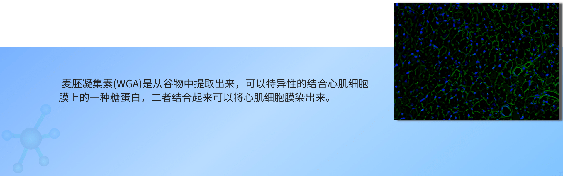 麦胚凝集素(WGA)是从谷物中提取出来,可以特异性的结合心肌细胞膜上的一种糖蛋白,二者结合起来可以将心肌细胞膜染出来。WGA可以把心肌细胞膜染出来,这样是否肥大的细胞从图像与正常组的对比就可以看出,也可以用专门的软件对染出的细胞进行直径、面积等的测量,能够分析心肌细胞是否肥大。